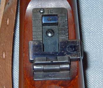 | La tacca di mira per le cartucce M94 con proiettile a testa tonda da 156 grani è tarata da 100 a 600 metri: i valori delle centinaia di metri sono indicati sul lato sinistro con la prima cifra (1-2……6) mentre i valori dei 50 metri sono indicati sul lato destro con dei trattini. | ||