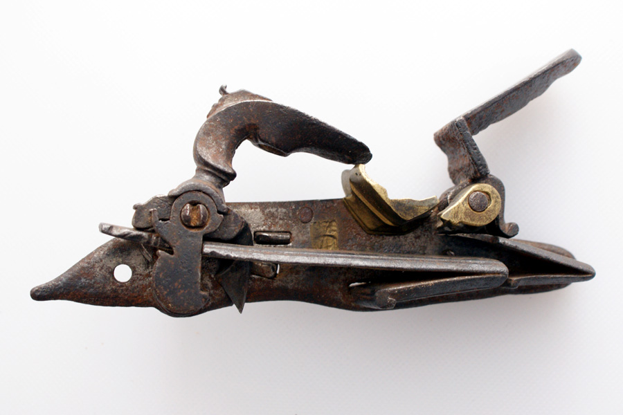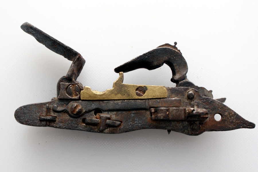 PIASTRA ALLA MICHELETTA - NAPOLI 18° SECOLO - CARTELLA PIATTA CON RESTI DI PUNZONE, SCODELLINO IN BRONZO ROTTO; GANASCIA SUPERIORE DEL CANE E VITONE MANCANTI l. CM 14